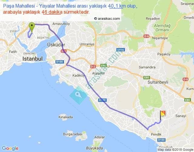 Paşa Mahallesi - Yayalar Mahallesi arası yaklaşık olarak 90 km/h ile yukarıda belirtilen sürede olup, iki yerin kuş uçuşu uzaklığı (mesafesi) 29'dir. Yolculuk otobüsle 59 dakika sürmektedir.