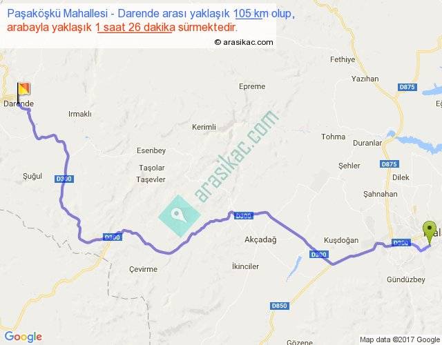 Paşaköşkü Mahallesi - Darende arası yaklaşık olarak 90 km/h ile yukarıda belirtilen sürede olup, iki yerin kuş uçuşu uzaklığı (mesafesi) 75'dir. Yolculuk otobüsle 1 saat 51 dakika sürmektedir.