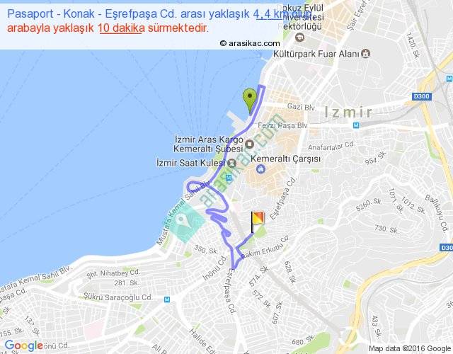 Pasaport - Konak - Eşrefpaşa Cd. arası yaklaşık olarak 90 km/h ile yukarıda belirtilen sürede olup, iki yerin kuş uçuşu uzaklığı (mesafesi) 1'dir. Yolculuk otobüsle 13 dakika sürmektedir.