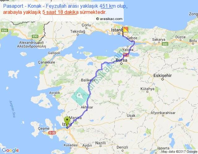 Pasaport - Konak - Feyzullah arası yaklaşık olarak 90 km/h ile yukarıda belirtilen sürede olup, iki yerin kuş uçuşu uzaklığı (mesafesi) 325'dir. Eğer belirtilen yerler arasında uçak seferi var ise bu süre uçakla 30 dakika'ya kadar düşebilir. Yolculuk otobüsle 6 saat 53 dakika sürmektedir.