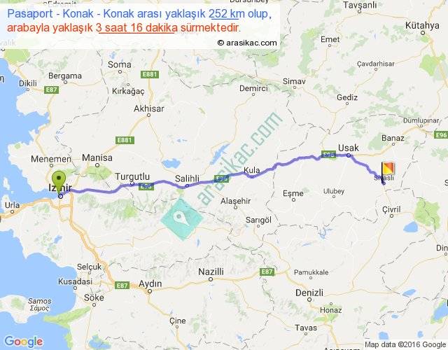 Pasaport - Konak - Konak arası yaklaşık olarak 90 km/h ile yukarıda belirtilen sürede olup, iki yerin kuş uçuşu uzaklığı (mesafesi) 220'dir. Yolculuk otobüsle 4 saat 14 dakika sürmektedir.