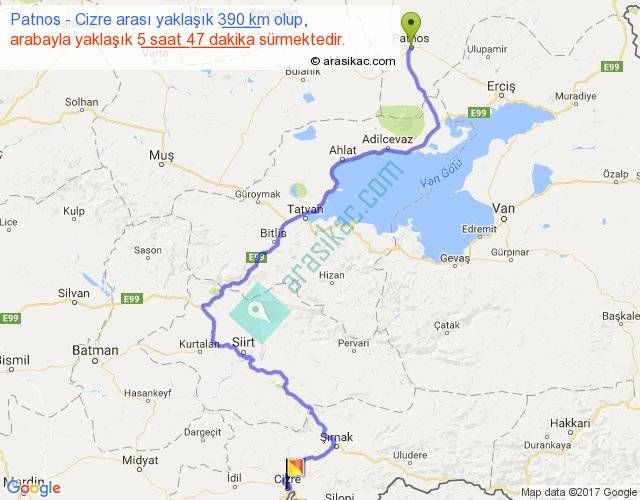 Patnos - Cizre arası yaklaşık olarak 90 km/h ile yukarıda belirtilen sürede olup, iki yerin kuş uçuşu uzaklığı (mesafesi) 218'dir. Yolculuk otobüsle 7 saat 31 dakika sürmektedir.