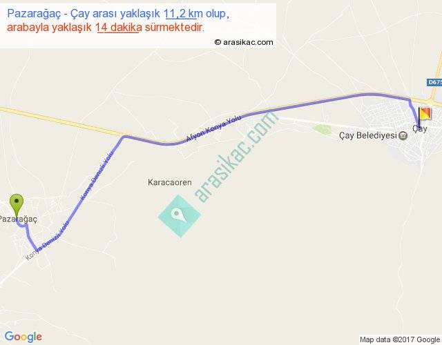 Pazarağaç - Çay arası yaklaşık olarak 90 km/h ile yukarıda belirtilen sürede olup, iki yerin kuş uçuşu uzaklığı (mesafesi) 9'dir. Yolculuk otobüsle 18 dakika sürmektedir.