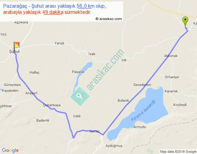 Pazarağaç - Şuhut arası yaklaşık olarak 90 km/h ile yukarıda belirtilen sürede olup, iki yerin kuş uçuşu uzaklığı (mesafesi) 33'dir. Yolculuk otobüsle 1 saat 3 dakika sürmektedir.