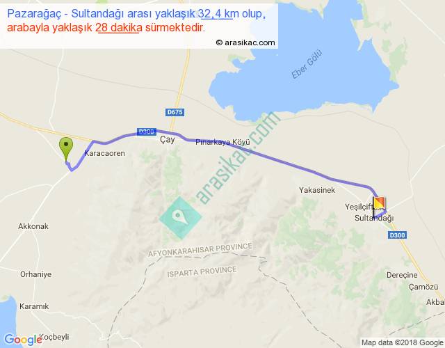 Pazarağaç - Sultandağı arası yaklaşık olarak 90 km/h ile yukarıda belirtilen sürede olup, iki yerin kuş uçuşu uzaklığı (mesafesi) 27'dir. Yolculuk otobüsle 36 dakika sürmektedir.