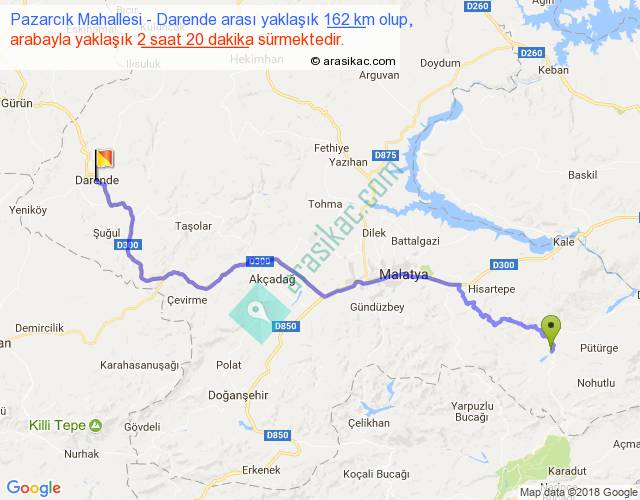 Pazarcık Mahallesi - Darende arası yaklaşık olarak 90 km/h ile yukarıda belirtilen sürede olup, iki yerin kuş uçuşu uzaklığı (mesafesi) 116'dir. Yolculuk otobüsle 3 saat 2 dakika sürmektedir.