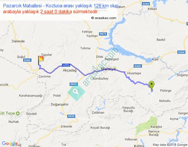 Pazarcık Mahallesi - Kozluca arası yaklaşık olarak 90 km/h ile yukarıda belirtilen sürede olup, iki yerin kuş uçuşu uzaklığı (mesafesi) 94'dir. Yolculuk otobüsle 2 saat 36 dakika sürmektedir.