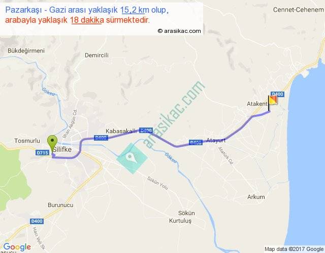 Pazarkaşı - Gazi arası yaklaşık olarak 90 km/h ile yukarıda belirtilen sürede olup, iki yerin kuş uçuşu uzaklığı (mesafesi) 13'dir. Yolculuk otobüsle 23 dakika sürmektedir.