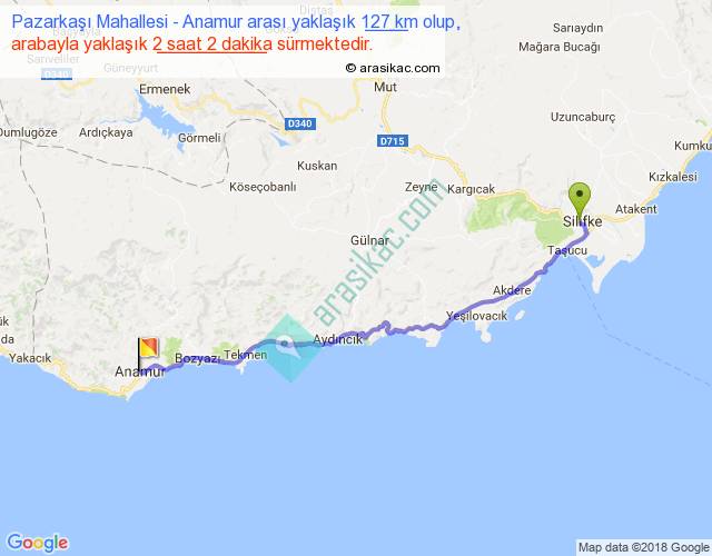 Pazarkaşı Mahallesi - Anamur arası yaklaşık olarak 90 km/h ile yukarıda belirtilen sürede olup, iki yerin kuş uçuşu uzaklığı (mesafesi) 102'dir. Yolculuk otobüsle 2 saat 38 dakika sürmektedir.