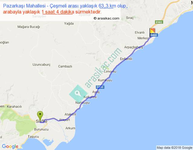 Pazarkaşı Mahallesi - Çeşmeli arası yaklaşık olarak 90 km/h ile yukarıda belirtilen sürede olup, iki yerin kuş uçuşu uzaklığı (mesafesi) 56'dir. Yolculuk otobüsle 1 saat 23 dakika sürmektedir.