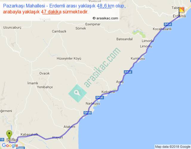 Pazarkaşı Mahallesi - Erdemli arası yaklaşık olarak 90 km/h ile yukarıda belirtilen sürede olup, iki yerin kuş uçuşu uzaklığı (mesafesi) 43'dir. Yolculuk otobüsle 1 saat 1 dakika sürmektedir.
