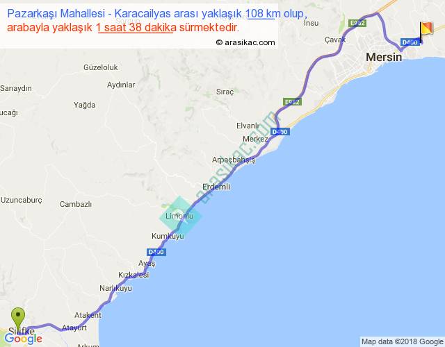Pazarkaşı Mahallesi - Karacailyas arası yaklaşık olarak 90 km/h ile yukarıda belirtilen sürede olup, iki yerin kuş uçuşu uzaklığı (mesafesi) 87'dir. Yolculuk otobüsle 2 saat 7 dakika sürmektedir.