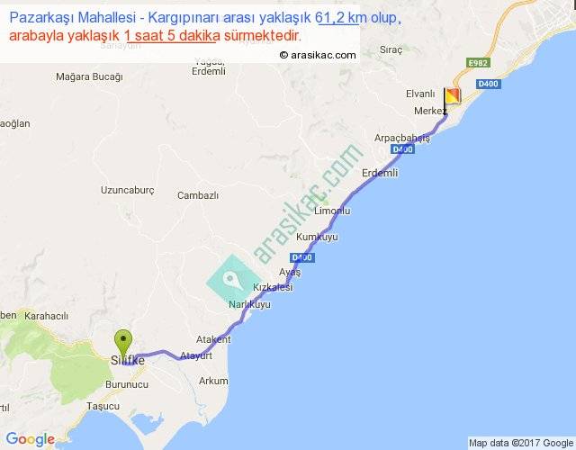 Pazarkaşı Mahallesi - Kargıpınarı arası yaklaşık olarak 90 km/h ile yukarıda belirtilen sürede olup, iki yerin kuş uçuşu uzaklığı (mesafesi) 55'dir. Yolculuk otobüsle 1 saat 24 dakika sürmektedir.
