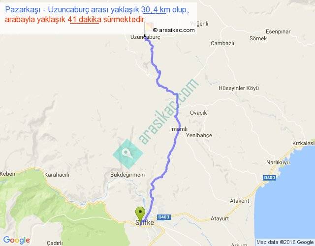 Pazarkaşı - Uzuncaburç arası yaklaşık olarak 90 km/h ile yukarıda belirtilen sürede olup, iki yerin kuş uçuşu uzaklığı (mesafesi) 23'dir. Yolculuk otobüsle 53 dakika sürmektedir.