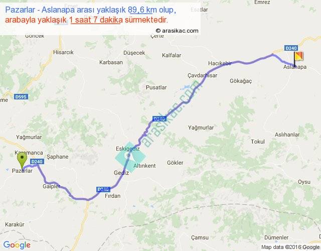 Pazarlar - Aslanapa arası yaklaşık olarak 90 km/h ile yukarıda belirtilen sürede olup, iki yerin kuş uçuşu uzaklığı (mesafesi) 68'dir. Yolculuk otobüsle 1 saat 27 dakika sürmektedir.
