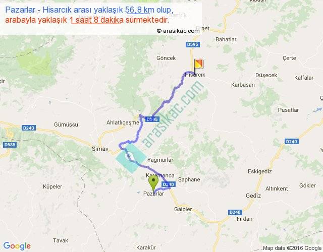 Pazarlar - Hisarcık arası yaklaşık olarak 90 km/h ile yukarıda belirtilen sürede olup, iki yerin kuş uçuşu uzaklığı (mesafesi) 29'dir. Yolculuk otobüsle 1 saat 28 dakika sürmektedir.
