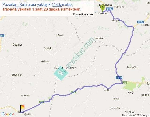 Pazarlar - Kula arası yaklaşık olarak 90 km/h ile yukarıda belirtilen sürede olup, iki yerin kuş uçuşu uzaklığı (mesafesi) 65'dir. Yolculuk otobüsle 1 saat 54 dakika sürmektedir.