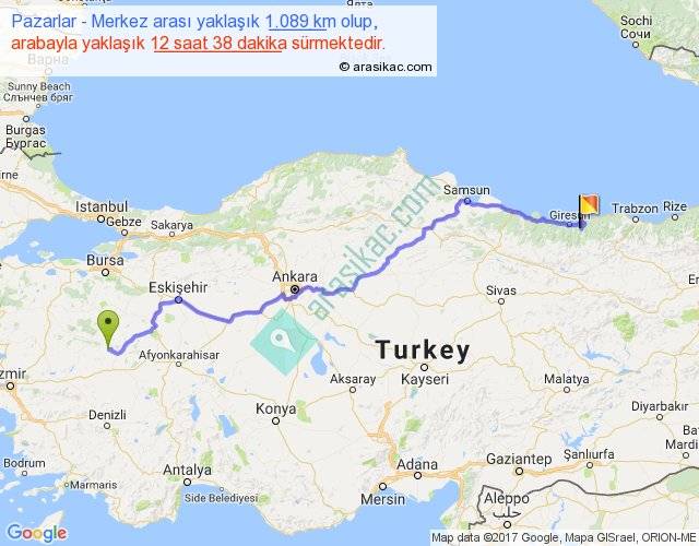 Pazarlar - Merkez arası yaklaşık olarak 90 km/h ile yukarıda belirtilen sürede olup, iki yerin kuş uçuşu uzaklığı (mesafesi) 831'dir. Eğer belirtilen yerler arasında uçak seferi var ise bu süre uçakla 1 saat 16 dakika'ya kadar düşebilir. Yolculuk otobüsle 16 saat 25 dakika sürmektedir.