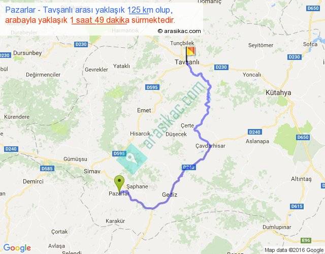 Pazarlar - Tavşanlı arası yaklaşık olarak 90 km/h ile yukarıda belirtilen sürede olup, iki yerin kuş uçuşu uzaklığı (mesafesi) 69'dir. Yolculuk otobüsle 2 saat 21 dakika sürmektedir.