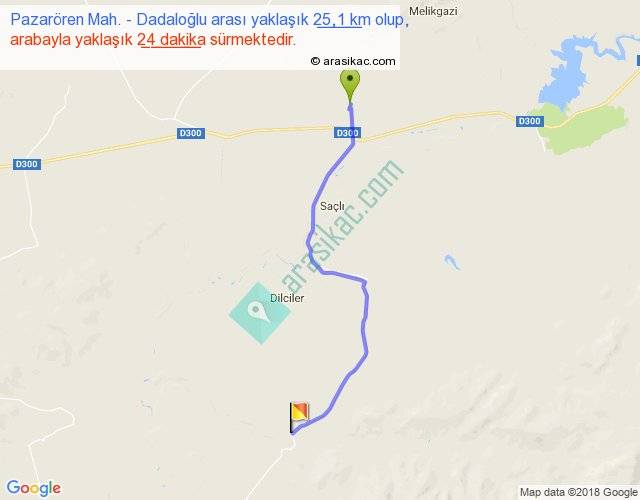 Pazarören Mah. - Dadaloğlu arası yaklaşık olarak 90 km/h ile yukarıda belirtilen sürede olup, iki yerin kuş uçuşu uzaklığı (mesafesi) 20'dir. Yolculuk otobüsle 31 dakika sürmektedir.
