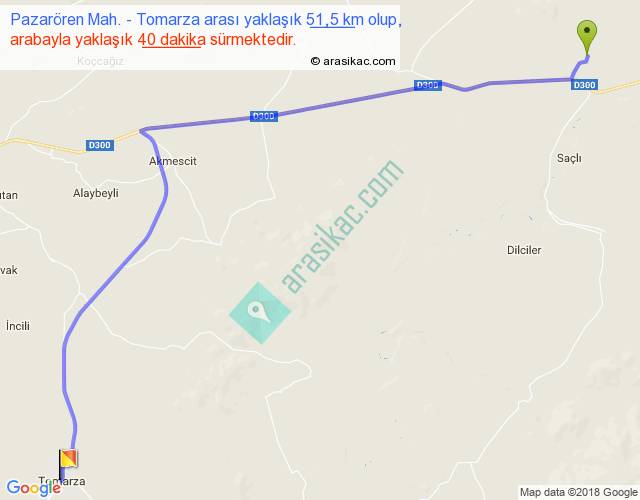 Pazarören Mah. - Tomarza arası yaklaşık olarak 90 km/h ile yukarıda belirtilen sürede olup, iki yerin kuş uçuşu uzaklığı (mesafesi) 40'dir. Yolculuk otobüsle 52 dakika sürmektedir.
