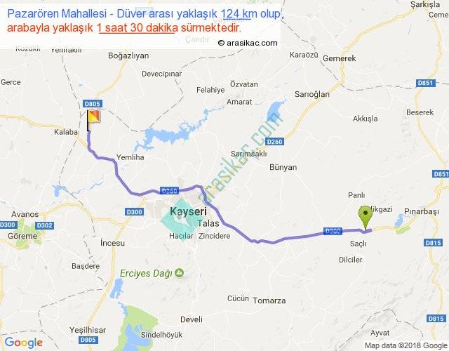 Pazarören Mahallesi - Düver arası yaklaşık olarak 90 km/h ile yukarıda belirtilen sürede olup, iki yerin kuş uçuşu uzaklığı (mesafesi) 99'dir. Yolculuk otobüsle 1 saat 57 dakika sürmektedir.