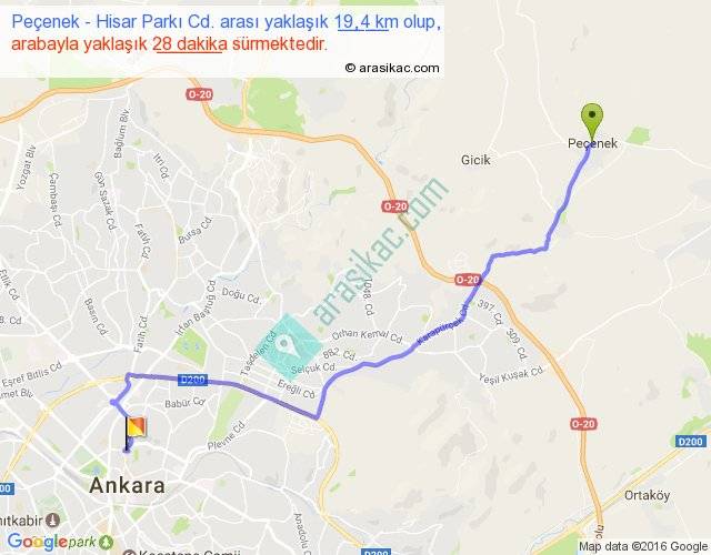 Peçenek - Hisar Parkı Cd. arası yaklaşık olarak 90 km/h ile yukarıda belirtilen sürede olup, iki yerin kuş uçuşu uzaklığı (mesafesi) 15'dir. Yolculuk otobüsle 36 dakika sürmektedir.
