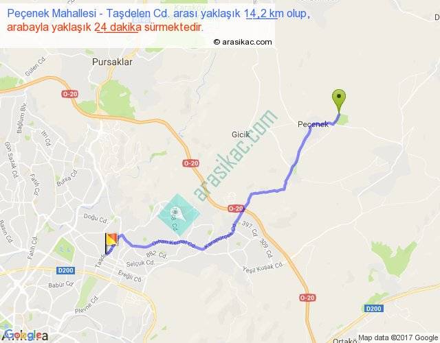 Peçenek Mahallesi - Taşdelen Cd. arası yaklaşık olarak 90 km/h ile yukarıda belirtilen sürede olup, iki yerin kuş uçuşu uzaklığı (mesafesi) 11'dir. Yolculuk otobüsle 31 dakika sürmektedir.