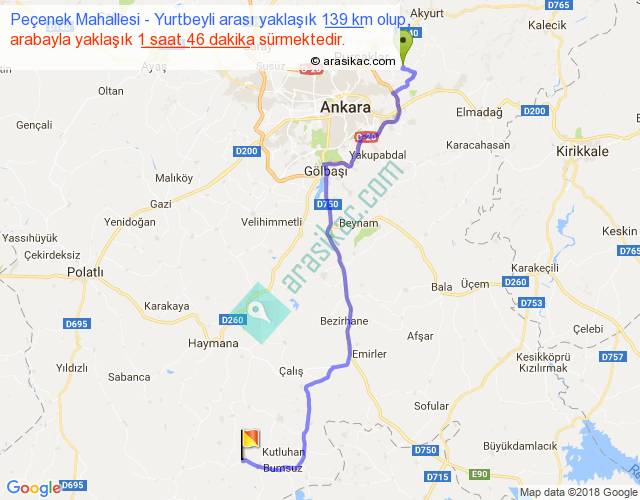 Peçenek Mahallesi - Yurtbeyli arası yaklaşık olarak 90 km/h ile yukarıda belirtilen sürede olup, iki yerin kuş uçuşu uzaklığı (mesafesi) 99'dir. Yolculuk otobüsle 2 saat 17 dakika sürmektedir.