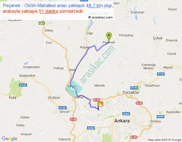 Peçenek - Ostim Mahallesi arası yaklaşık olarak 90 km/h ile yukarıda belirtilen sürede olup, iki yerin kuş uçuşu uzaklığı (mesafesi) 28'dir. Yolculuk otobüsle 1 saat 6 dakika sürmektedir.