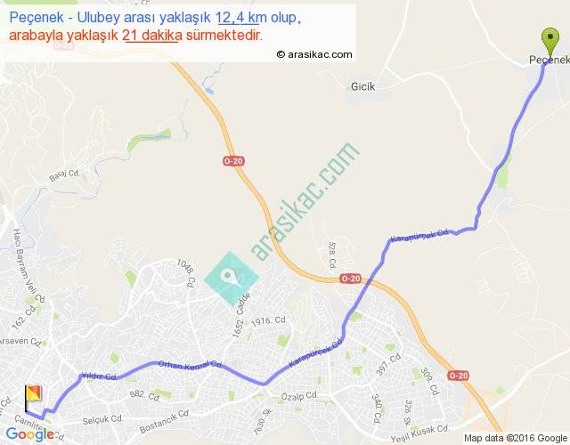 Peçenek - Ulubey arası yaklaşık olarak 90 km/h ile yukarıda belirtilen sürede olup, iki yerin kuş uçuşu uzaklığı (mesafesi) 10'dir. Yolculuk otobüsle 27 dakika sürmektedir.