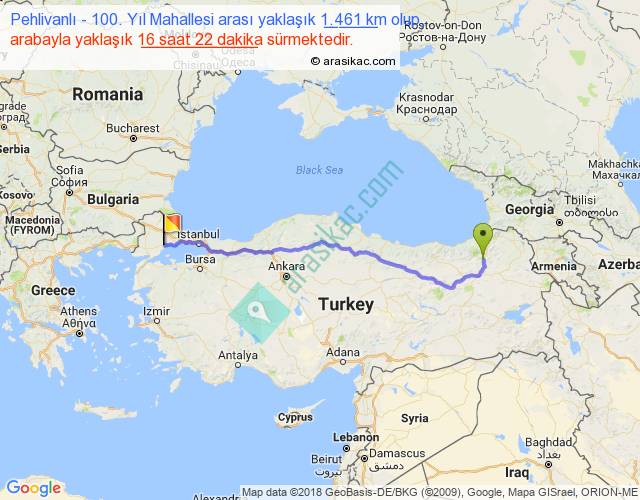 Pehlivanlı - 100. Yıl Mahallesi arası yaklaşık olarak 90 km/h ile yukarıda belirtilen sürede olup, iki yerin kuş uçuşu uzaklığı (mesafesi) 1171'dir. Eğer belirtilen yerler arasında uçak seferi var ise bu süre uçakla 1 saat 48 dakika'ya kadar düşebilir. Yolculuk otobüsle 21 saat 16 dakika sürmektedir.
