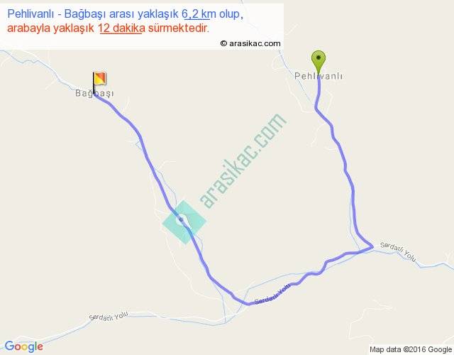 Pehlivanlı - Bağbaşı arası yaklaşık olarak 90 km/h ile yukarıda belirtilen sürede olup, iki yerin kuş uçuşu uzaklığı (mesafesi) 2'dir. Yolculuk otobüsle 15 dakika sürmektedir.