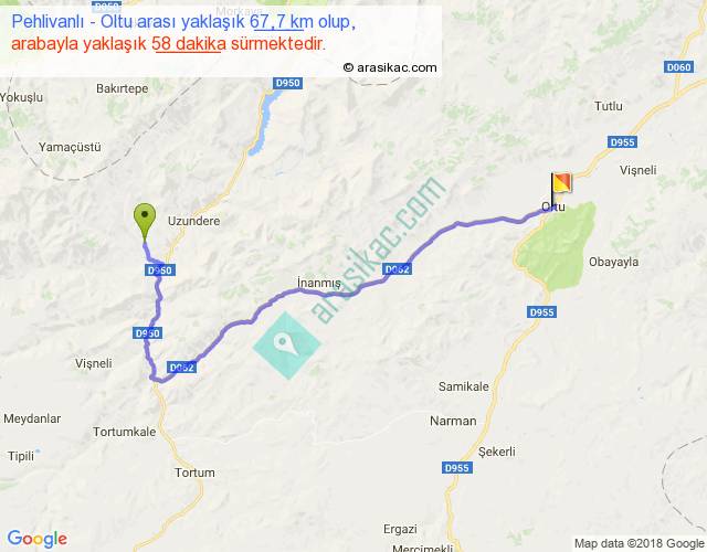 Pehlivanlı - Oltu arası yaklaşık olarak 90 km/h ile yukarıda belirtilen sürede olup, iki yerin kuş uçuşu uzaklığı (mesafesi) 43'dir. Yolculuk otobüsle 1 saat 15 dakika sürmektedir.