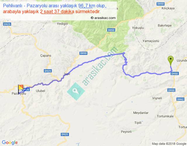 Pehlivanlı - Pazaryolu arası yaklaşık olarak 90 km/h ile yukarıda belirtilen sürede olup, iki yerin kuş uçuşu uzaklığı (mesafesi) 61'dir. Yolculuk otobüsle 3 saat 24 dakika sürmektedir.