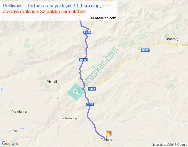 Pehlivanlı - Tortum arası yaklaşık olarak 90 km/h ile yukarıda belirtilen sürede olup, iki yerin kuş uçuşu uzaklığı (mesafesi) 25'dir. Yolculuk otobüsle 41 dakika sürmektedir.
