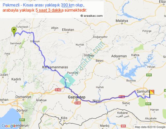 Pekmezli - Kısas arası yaklaşık olarak 90 km/h ile yukarıda belirtilen sürede olup, iki yerin kuş uçuşu uzaklığı (mesafesi) 277'dir. Eğer belirtilen yerler arasında uçak seferi var ise bu süre uçakla 25 dakika'ya kadar düşebilir. Yolculuk otobüsle 6 saat 33 dakika sürmektedir.
