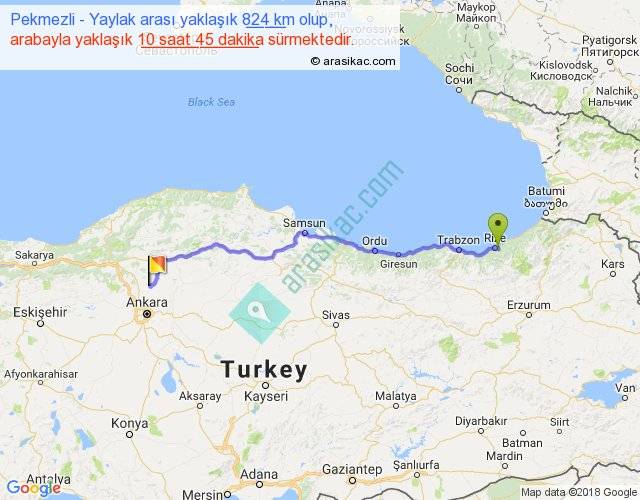 Pekmezli - Yaylak arası yaklaşık olarak 90 km/h ile yukarıda belirtilen sürede olup, iki yerin kuş uçuşu uzaklığı (mesafesi) 645'dir. Eğer belirtilen yerler arasında uçak seferi var ise bu süre uçakla 59 dakika'ya kadar düşebilir. Yolculuk otobüsle 13 saat 58 dakika sürmektedir.