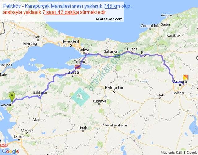 Pelitköy - Karapürçek Mahallesi arası yaklaşık olarak 90 km/h ile yukarıda belirtilen sürede olup, iki yerin kuş uçuşu uzaklığı (mesafesi) 520'dir. Eğer belirtilen yerler arasında uçak seferi var ise bu süre uçakla 48 dakika'ya kadar düşebilir. Yolculuk otobüsle 10 saat 0 dakika sürmektedir.
