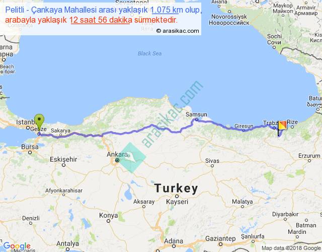 Pelitli - Çankaya Mahallesi arası yaklaşık olarak 90 km/h ile yukarıda belirtilen sürede olup, iki yerin kuş uçuşu uzaklığı (mesafesi) 874'dir. Eğer belirtilen yerler arasında uçak seferi var ise bu süre uçakla 1 saat 20 dakika'ya kadar düşebilir. Yolculuk otobüsle 16 saat 48 dakika sürmektedir.