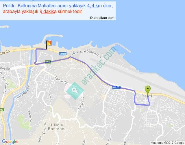 Pelitli - Kalkınma Mahallesi arası yaklaşık olarak 90 km/h ile yukarıda belirtilen sürede olup, iki yerin kuş uçuşu uzaklığı (mesafesi) 3'dir. Yolculuk otobüsle 11 dakika sürmektedir.