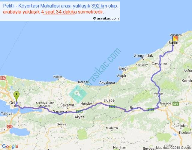 Pelitli - Köyortası Mahallesi arası yaklaşık olarak 90 km/h ile yukarıda belirtilen sürede olup, iki yerin kuş uçuşu uzaklığı (mesafesi) 254'dir. Eğer belirtilen yerler arasında uçak seferi var ise bu süre uçakla 23 dakika'ya kadar düşebilir. Yolculuk otobüsle 5 saat 56 dakika sürmektedir.