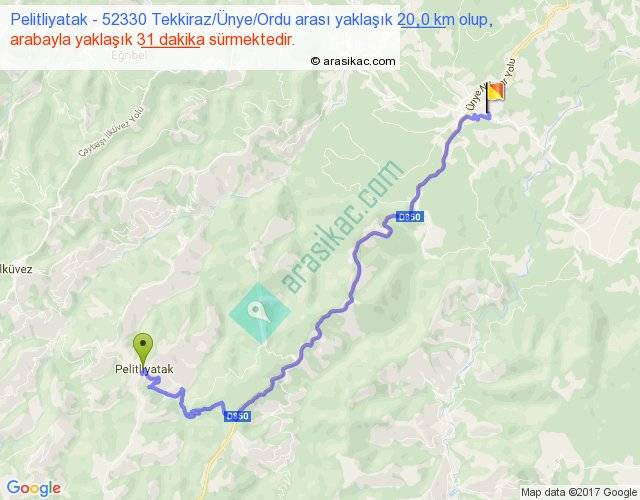 Pelitliyatak - 52330 Tekkiraz Ünye Ordu arası yaklaşık olarak 90 km/h ile yukarıda belirtilen sürede olup, iki yerin kuş uçuşu uzaklığı (mesafesi) 12'dir. Yolculuk otobüsle 40 dakika sürmektedir.