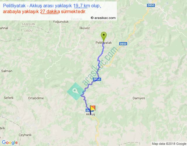 Pelitliyatak - Akkuş arası yaklaşık olarak 90 km/h ile yukarıda belirtilen sürede olup, iki yerin kuş uçuşu uzaklığı (mesafesi) 14'dir. Yolculuk otobüsle 35 dakika sürmektedir.
