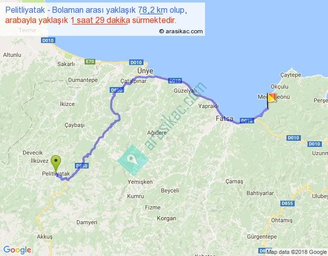 Pelitliyatak - Bolaman arası yaklaşık olarak 90 km/h ile yukarıda belirtilen sürede olup, iki yerin kuş uçuşu uzaklığı (mesafesi) 50'dir. Yolculuk otobüsle 1 saat 55 dakika sürmektedir.