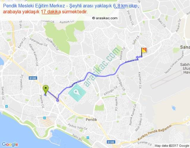 Pendik Mesleki Eğitim Merkez - Şeyhli arası yaklaşık olarak 90 km/h ile yukarıda belirtilen sürede olup, iki yerin kuş uçuşu uzaklığı (mesafesi) 5'dir. Yolculuk otobüsle 22 dakika sürmektedir.