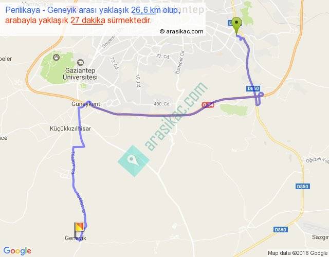 Perilikaya - Geneyik arası yaklaşık olarak 90 km/h ile yukarıda belirtilen sürede olup, iki yerin kuş uçuşu uzaklığı (mesafesi) 15'dir. Yolculuk otobüsle 35 dakika sürmektedir.