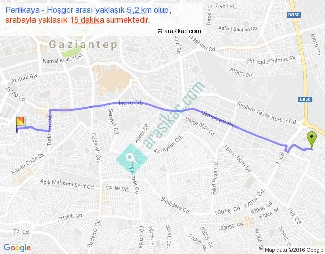 Perilikaya - Hoşgör arası yaklaşık olarak 90 km/h ile yukarıda belirtilen sürede olup, iki yerin kuş uçuşu uzaklığı (mesafesi) 4'dir. Yolculuk otobüsle 19 dakika sürmektedir.