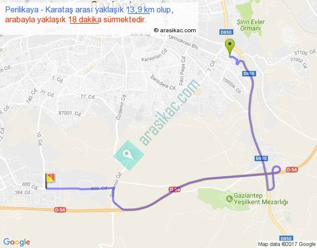 Perilikaya - Karataş arası yaklaşık olarak 90 km/h ile yukarıda belirtilen sürede olup, iki yerin kuş uçuşu uzaklığı (mesafesi) 7'dir. Yolculuk otobüsle 23 dakika sürmektedir.