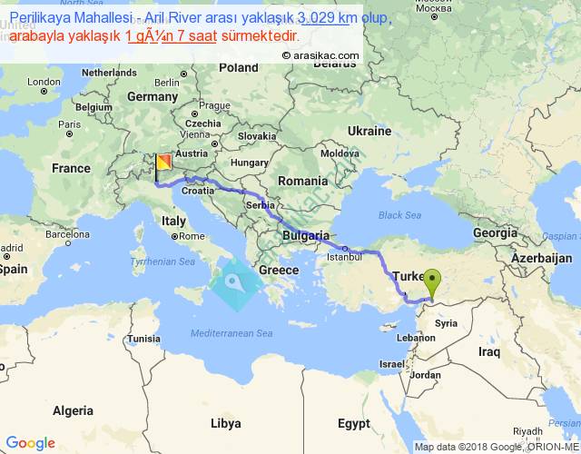 Perilikaya Mahallesi - Aril River arası yaklaşık olarak 90 km/h ile yukarıda belirtilen sürede olup, iki yerin kuş uçuşu uzaklığı (mesafesi) 2393'dir. Eğer belirtilen yerler arasında uçak seferi var ise bu süre uçakla 3 saat 40 dakika'ya kadar düşebilir. Yolculuk otobüsle 1 gün 16 saat sürmektedir.
